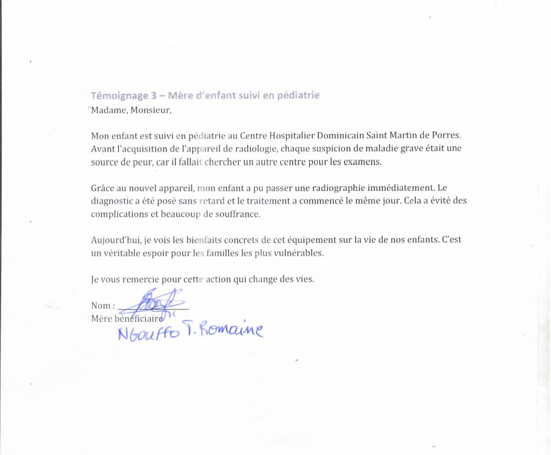 My child is being treated in pediatrics at the Dominican Hospital Centre Saint Martin de Porres. Before the acquisition of the radiology machine, every suspicion of serious illness was a source of fear, because it was necessary to find another center for the examinations.