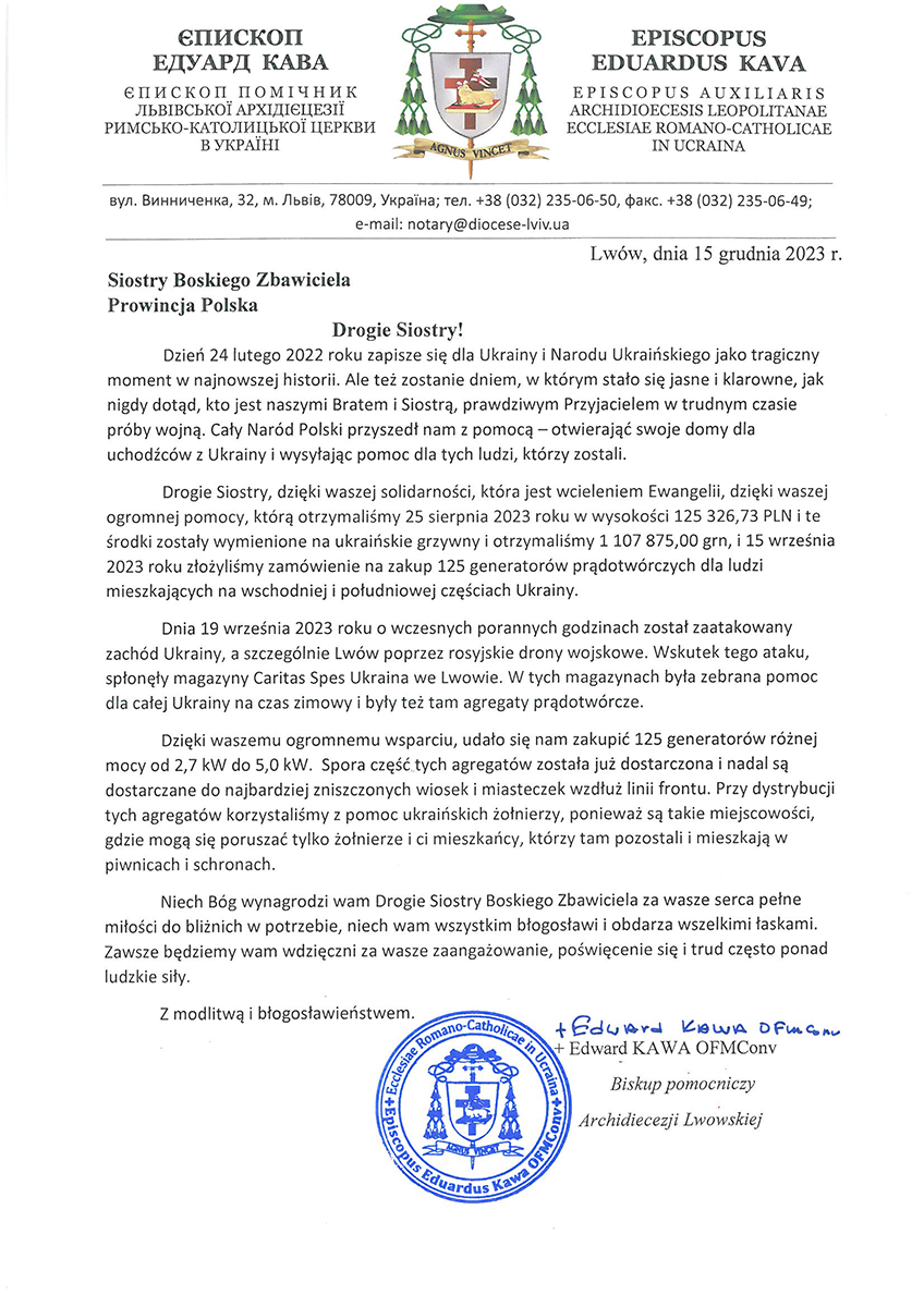 When war came to Ukraine, the Sisters of the Divine Savior answered the call to ensure the safety of those left behind. Thanks to a grant from Sisters Rising Worldwide, the Sisters provided generators to the people living in some of the most devastated communities. Below is a translation of the thank you letter recieved from the Auxiliary Archbishop of the Archdiocese of Lviv. Thank you to our donors for ensuring Sisters around the world can provide swift aid to those in need.